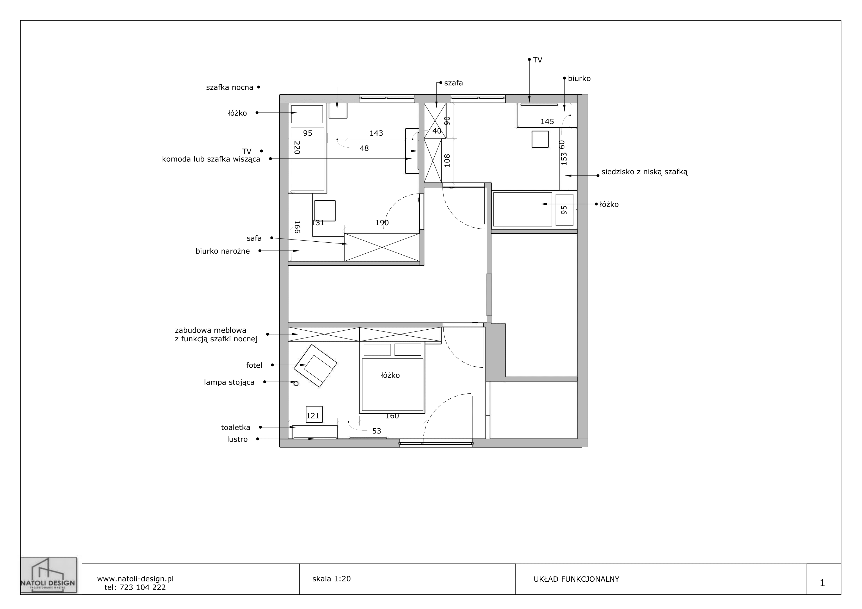 - Układ funkcjonalny obejmuje meble oraz zmiany ścian działowych
