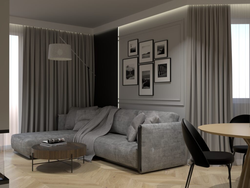 Planowanie rozmieszczenia pomieszczeń – kuchni, określenie lokalizacji podstawowych urządzeń, takich jak lodówka, zlewozmywak, płyta grzewcza, zabudowa wysoka i szafki wiszące. W salonie ustalamy pozycję sofy z uwzględnieniem przestrzeni. W jadalni dopasowujemy rozmiar i kształt stołu. Ten etap pozwoli określić możliwości co do wielkości lokalu.